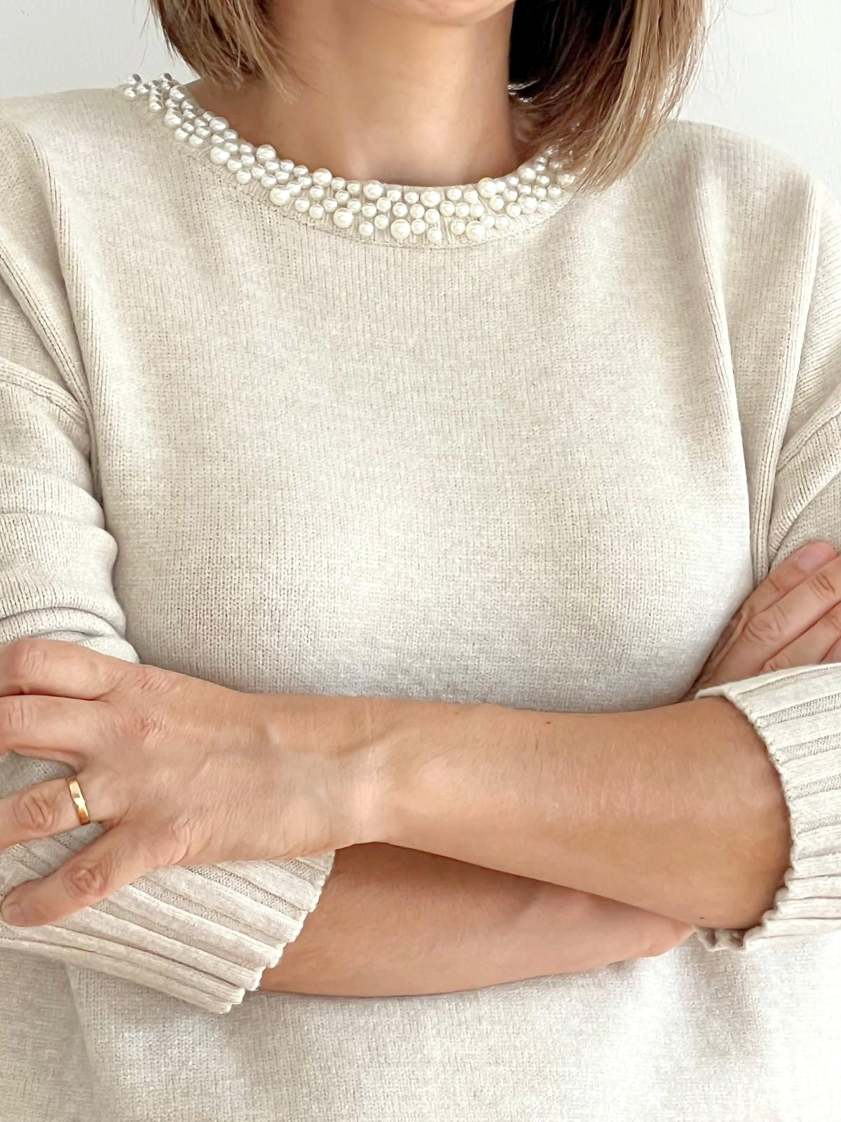 Detalhes: Camisola de malha em cru, perfeita para o tempo mais fresco. Pérolas cravadas na zona frontal do colarinho.