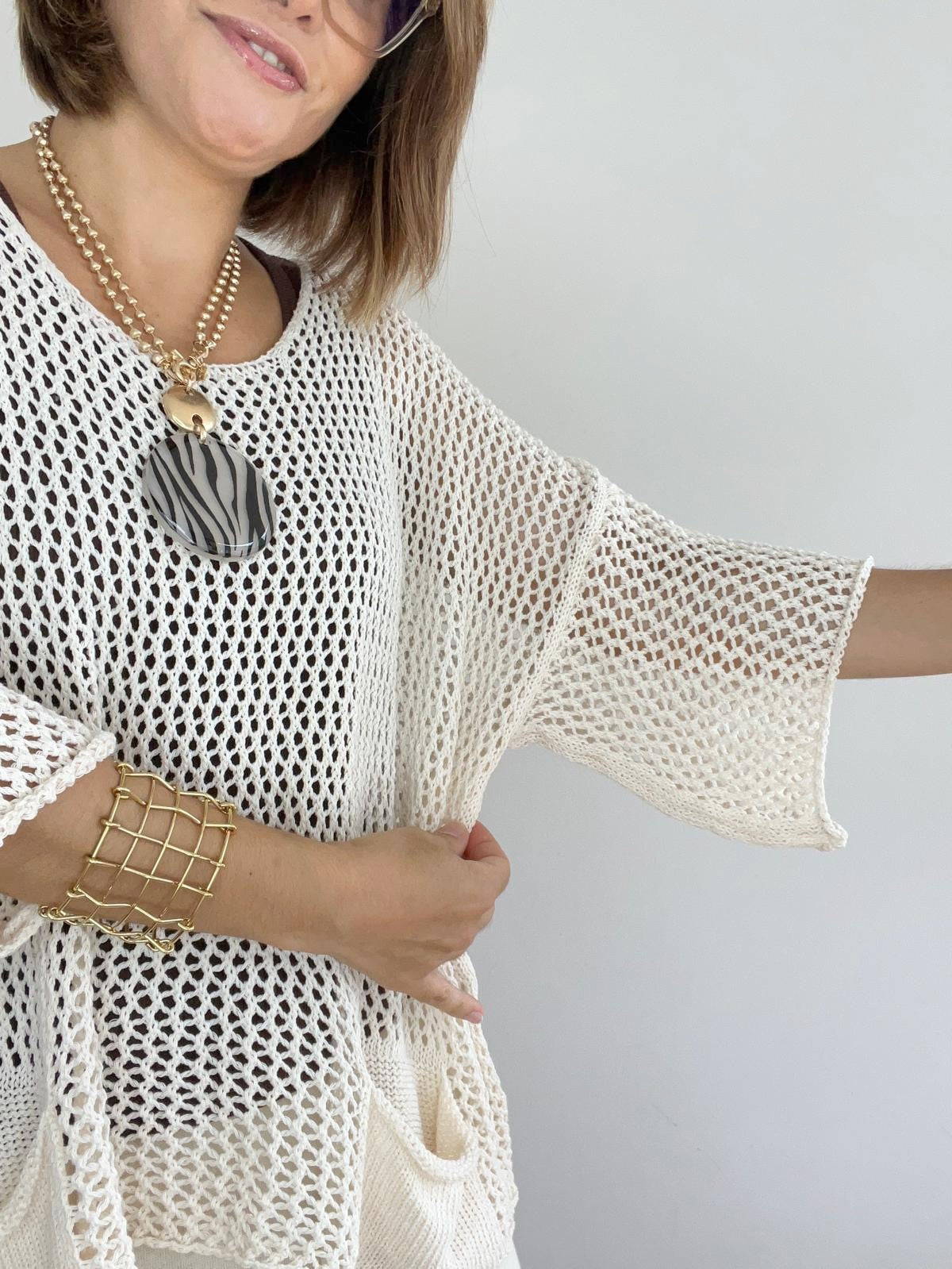 Detalhes: Camisola crivada, em tom cru, com bolsos frontais.