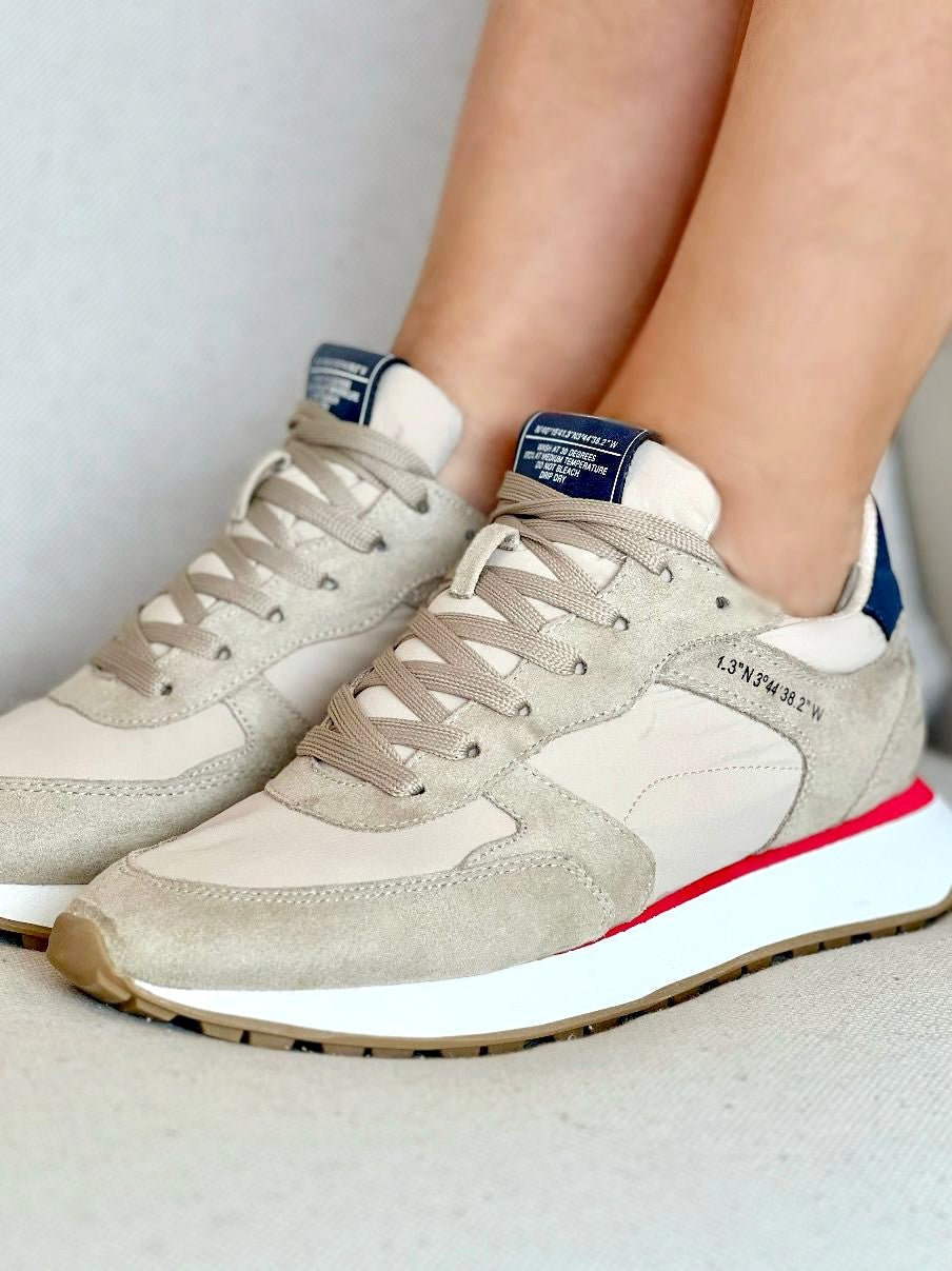 Descrição: Sapatilha desportiva com combinação de cores neutras, com apontamento de azul marinho e vermelho.